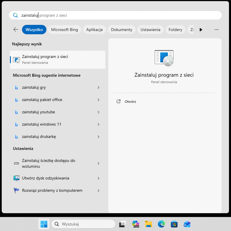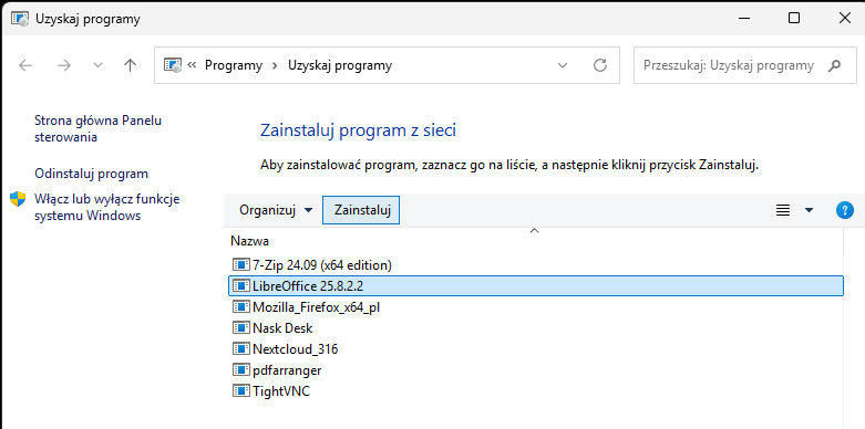 Program LibreOffice został przygotowany do instalacji przez administratora sieci. Aby zainstalować, należy wykonać następujące kroki: W menu START (logo Windows) wpisać słowo Zainstaluj. W menu pojawi się funkcja Zainstaluj program z sieci i należy wybrać tę pozycję.
