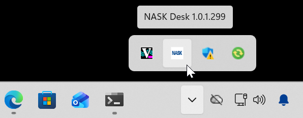 Po uruchomieniu (tj. wywołaniu przez EZD bądź ręcznym uruchomieniu z menu, które także jest możliwe), program NASK Desk znajduje się w obszarze Tray w prawym dolnym rogu ekranu: