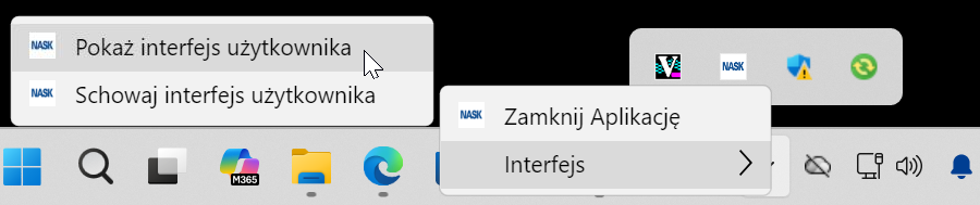 Poprzez wybór prawym przyciskiem myszy ikony aplikacji NASK Desk, a następnie wybór pozycji Interfejs > Pokaż interfejs użytkownika