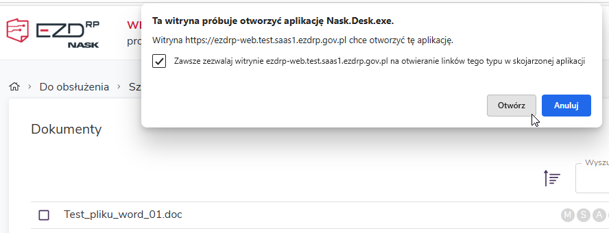 Programu NASK Desk nie trzeba ręcznie uruchamiać. Program będzie wywoływany automatycznie przez przeglądarkę. Za pierwszym razem pojawi się okno z pytaniem o zezwolenie – należy wybrać Zawsze zezwalaj… i zatwierdzić Otwórz
